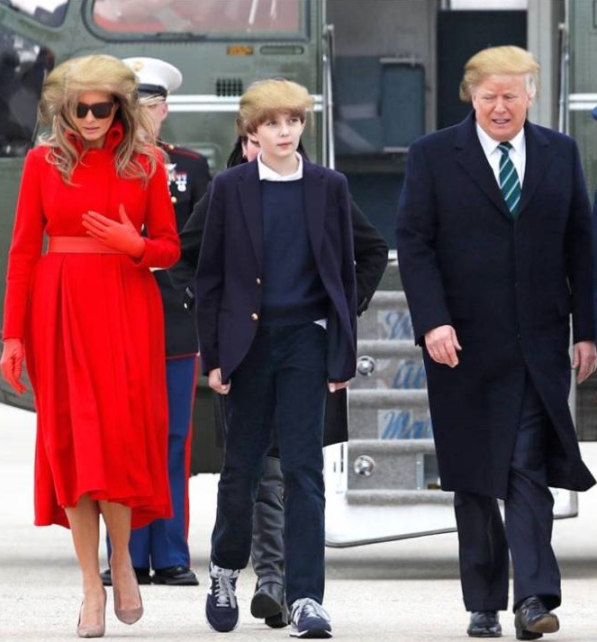 Mr Trump made the announcement to reporters before boarding Air Force One for a trip to console the families of victims of America’s latest mass shooting which has yet to occur. He was accompanied by a woman resembling his wife Melania and their son Barron.