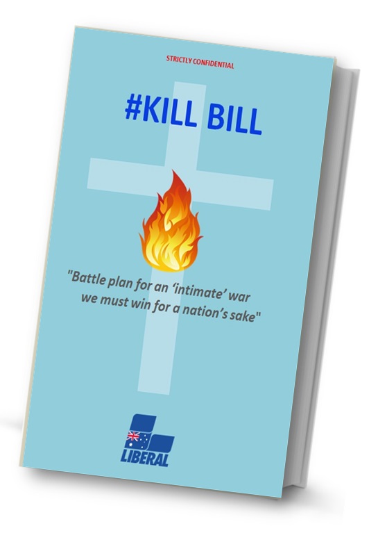 The 36 page document, headed #KILL BILL in deep Liberal blue on what looks like a 50% cyan screen bled to the edges and subtitled “Battle plan for an “intimate” war we must win for a nation’s sake” italicised in an equally pleasing 70% black screen, includes 33 pages, each one devoted to a daily strategy for the expected 33 days of the campaign.