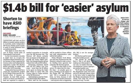 Now today in its Saturday edition The Courier-Mail runs another “exclusive” story on the Bill, this time pointing to a possible “$1.4 billion bill” for taxpayers if Dr Phelps’ legislation becomes law and requires the reopening of the Christmas Island detention centre (main picture).