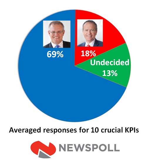 These KPIs average out at: Morrison 69%; Shorten 18%; Undecided 13% (top image).