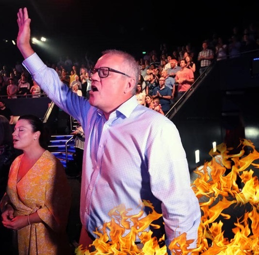 After hearing Scott Morrison declare that he and his ministry would “burn for Australia” you are rather embarrassed over the pleasure you get from a vision of a town square somewhere with stakes all over it with Scottie starting to smoulder, Michaelia melting away, Josh just becoming fully alight and Peter being helped on his way with more than a splash of high-octane petrol thrown lustily by a cheering mob.