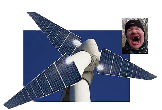 Mr D’Resistance has taken out world patents on his clever, ground-breaking invention: normal wind-powered turbines but whose massive blades are covered entirely with solar panels!
