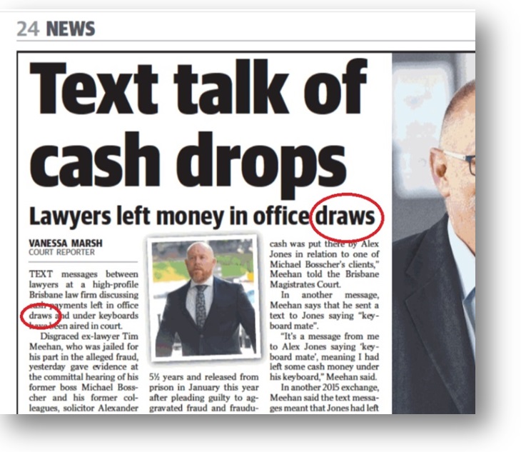 These thoughts came to mind when reading a story (main picture) in The Courier-Mail, Brisbane’s daily tabloid, last Thursday about some lawyers who are in hot water over their alleged fraudulent handling of clients’ cash.