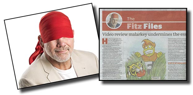 Railing against any idea that the AFL should introduce the forensic analysis the bunker now brings to rugby league (such as whether a player’s foot has brushed the sideline), FitzSimons penned this piece of dribble in his weekend Herald sports column, The Fitz Files: “…there seems to also be a tacit agreement (in the AFL) that if a bloke is tearing along the boundary line then it is not worth worrying about whether he puts his foot out or not, because, you know, close enough is good enough. He MEANS to stay in and that’s what counts”.