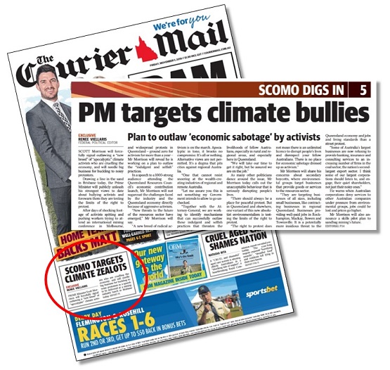 She told readers that the PM would “forcefully” foreshadow outlawing “apocalyptic” climate change activists, and went on to claim the protestors were “cruelling the economy”.