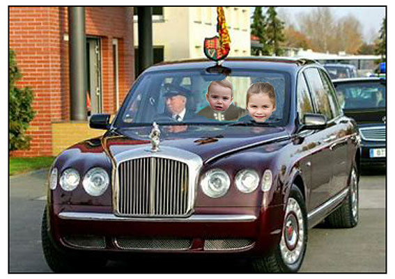 Princess Charlotte and Prince Louis are pictured (at top) late yesterday afternoon UK time leaving Kensington Palace for the last time.