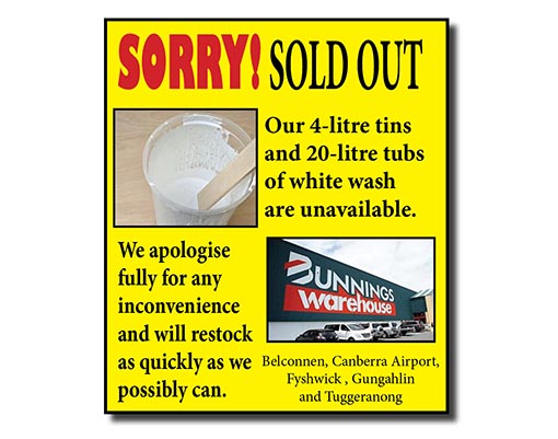 Bunnings Warehouses is reporting that all of its three Canberra outlets and two others in the ACT have sold out of their four-litre tins and 20-litre tubs of popular white wash.