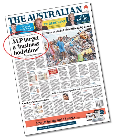 There under The Oz masthead was the headline statement: ALP target a ‘business bodyblow’.