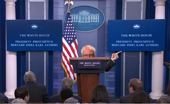 In the lead-up to the primaries in which 1,344 delegates are at stake, Senator Sanders has taken to holding news conferences and public rallies on a fake White House podium (main picture).