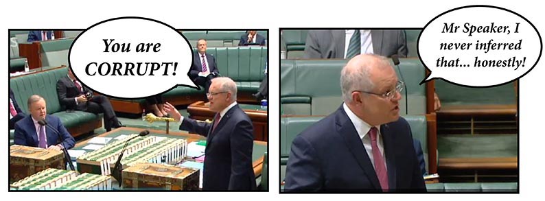 Apart from Morrison’s disgraceful attempt to talk over and bully the Speaker, he is also guilty of one or several things.