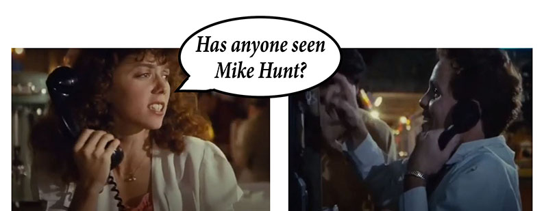 “Has anyone seen Mike Hunt?” she asks innocently, repeating her folly as the guffaws erupt around the room. “Has anyone seen Mike Hunt?”