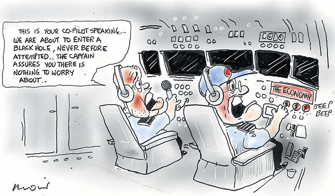 Although Moir’s cartoon clearly defines Treasurer Josh Frydenberg as the co-pilot in his cartoon (at top), why is the Treasurer sitting in the captain’s traditional seat on the left, especially during what appears to be a major mid-flight emergency?