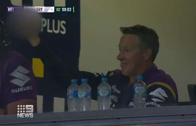 The lighthearted “bird” had been flipped by coach Craig Bellamy (shown above) towards Cameron Smith on the field after the Storm captain had gone past Bellamy’s try-scoring record.