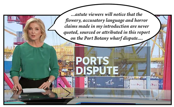 Let’s start with the ABC’s 7pm Sydney report on Monday night on the dispute at Port Botany. Here’s Juanita Phillips’ intro: “Waterfront workers in Sydney have been accused of holding the country to ransom over a long-running pay dispute with shipping giant Patrick. The federal government says the union action is threatening crucial supplies being imported as well as international exports.”