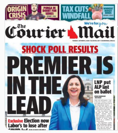The Bug: You have to accept that at the start of a fairly short campaign of less than four weeks and with authorities tipping that maybe up to 70 per cent of Queenslanders will vote early, a poll giving Labor a clear 52-48 two-party preferred lead plays into Premier Palaszczuk’s hands? Even Deb Frecklington has come out quickly to say how important it is to elect a single majority government charged with economic recovery after the pandem…