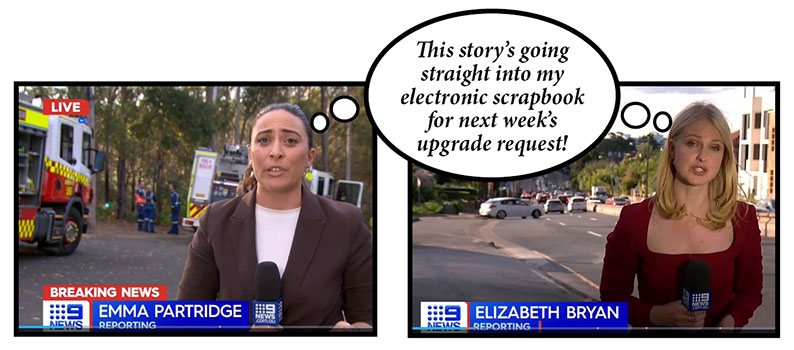 Less than five minutes in, here’s reporter Emma Partridge on a bushfire at North Rocks: “Firefighters have done an unbelievable job in getting this fire under control…”