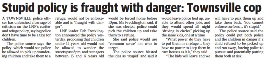 “I read the Townsville Bulletin and the Courier on the same day and both had stories about the LNP’s child curfew policy, but the Courier devoted its front page to it (main picture) and a positive treatment inside,” the reader said.
