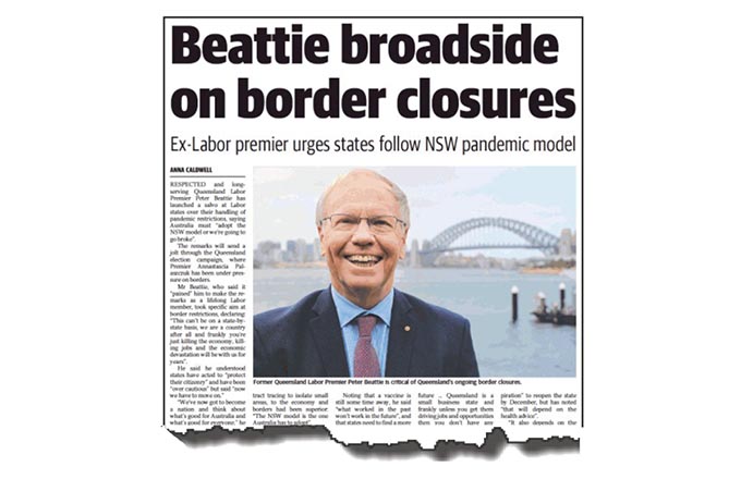 In his qualifying remarks, which lasted 15 minutes, Mr Beattie criticised the border closures imposed by “only two-term-winning” Labor Premier Annastacia Palaszczuk and to laud the approach taken by her NSW Liberal Party counterpart, Premier Gladys Berejiklian.