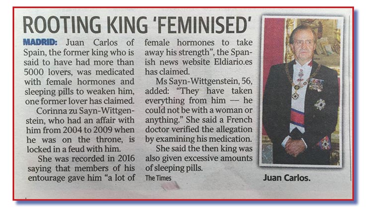 The Glass House spotted this charming heading (above) in Wednesday’s Daily Torygraph on a little yarn about the number of conquests by randy Juan Carlos, the former king of Spain and the alleged need for him to be dosed with drugs to curb his libido.