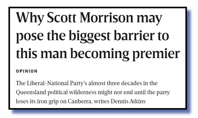 Atkins’ piece was a perfectly reasoned and presented case based on political history; Queensland in four years’ time is likely to vote Labor again if the conservatives hold power in Canberra, be they led by Morrison or Tim Wilson (insert canned laughter). Nowhere in his piece does he talk of the federal government’s – or Morrison’s – iron grip on power.