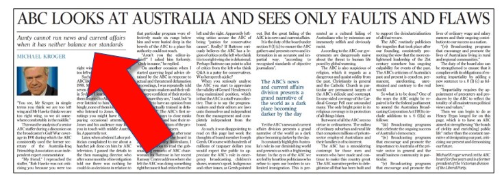 For an example of a rather risky standfirst, consider a column appearing in last Thursday’s national broadshit The Australian by Liberal Party heavyweight Michael Kroger.