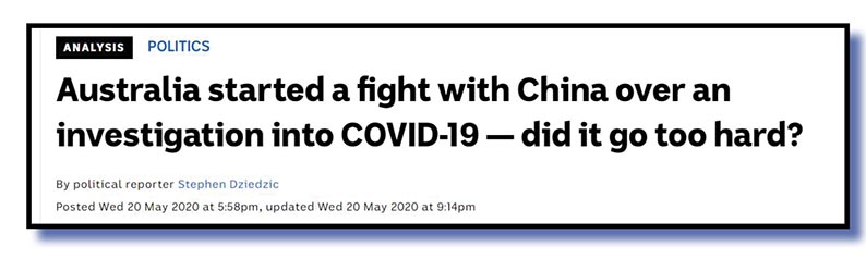 ABC journalist Stephen Dziedzic on May 20 rightly described those two comments as “political dynamite”. Dziedzic wrote: The Chinese Government was – predictably – incensed, accusing Australia of launching a political attack on China and “pandering” to the United States.