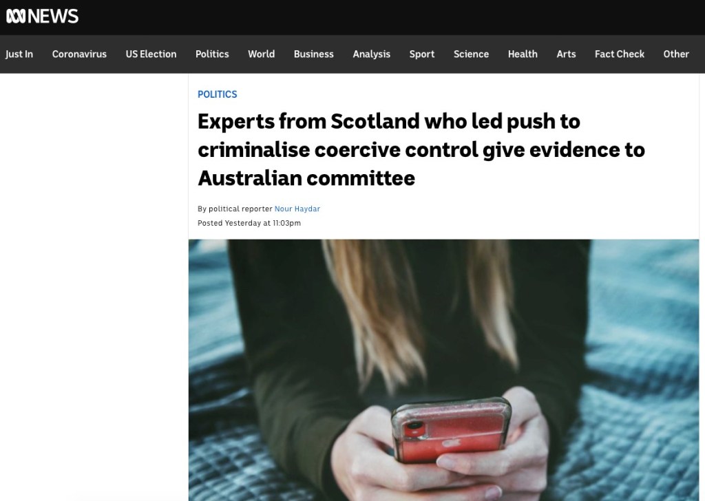 The ABC Online news website is running a story about laws in force in Scotland that tackle the problem of coercive control in domestic violence situations – where one person in a relationship uses behaviour such as threats, insults, control of finances, to dominate and control another.