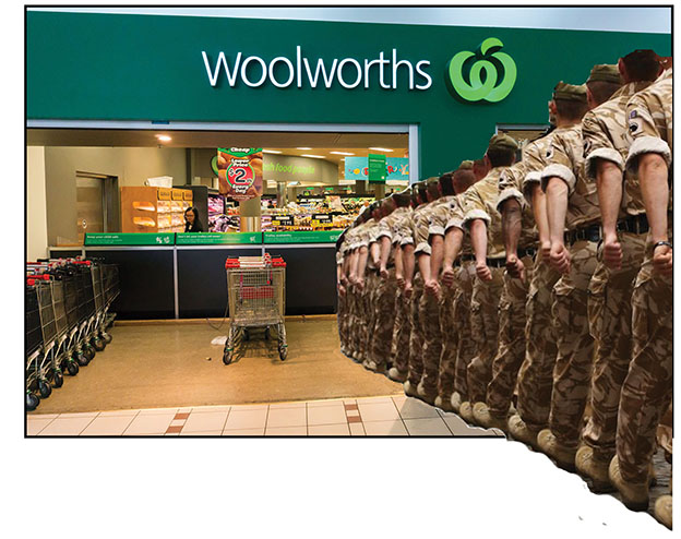 Above: Troops from the crack 1st Royal Australian Regiment based at Enoggera Barracks in inner-Brisbane march into the nearby Woolies at Ashgrove to begin an arduous eight-hour shift sitting on the shelves in the tinned vegetables, soups and sauces aisle. Other soldiers from the base’s 7th Combat Brigade went straight to the toilet paper, paper towels and tissues aisle to take up positions there. The troops were replaced late in the afternoon if they hadn’t been sold by then, either through normal, controlled shopping or as a result of shameful panic buying.