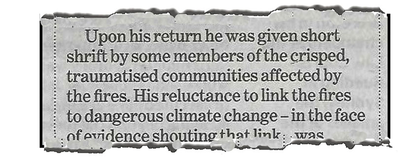 Below is how Jacqueline used “crisped” in her column while recounting last summer’s terrible bush fires and how Scott Morrison was treated when he visited the fire zones.