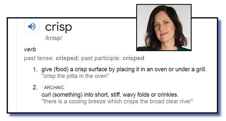 And it’s over her use of the word, crisped, the past tense of crisp, the process by which you give food a crisp surface by placing it in an oven or under a grill.