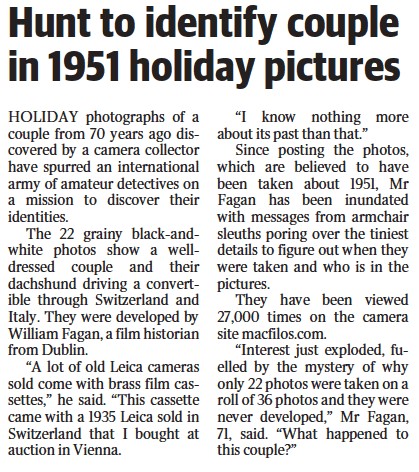 News outlets elsewhere have run at least some of the photos in an effort to help solve the mystery of the couple’s identity. It will be a good yarn if that ever happens.