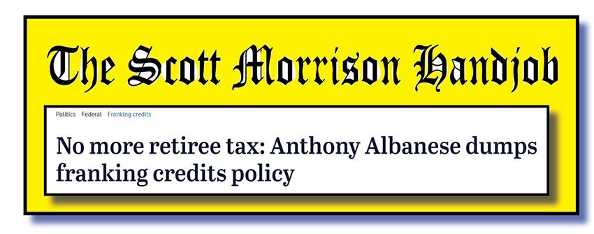 At top is what the SMH – perhaps that should stand for The Scott Morrison Handjob from now on – carried on its website for a story about Opposition Leader Anthony Albanese’s decision to ditch the franking credits policy the ALP took to the 2019 poll.