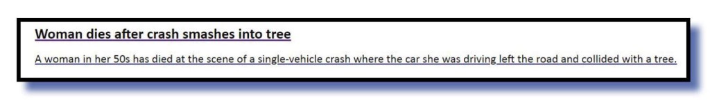 Firstly, look at that heading; it’s a real attention getter! No wonder the poor thing died. She’s obviously had two separate crashes. Or at least a crash and a smash. Did both contribute equally to her demise? That is still to be determined by the coroner, we suspect.