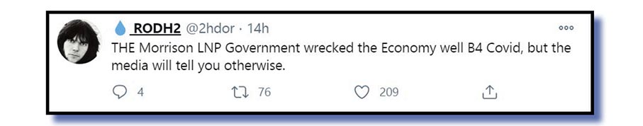 Below are a few recent tweets by people with just that sort of message. I retweeted their thoughts on Morrison’s cowardly lack of criticism of Trump’s seditious treachery, his economic mismanagement, the foolishness that flows from the lips of the fops, flops and frauds in his ministry, and then followed them!