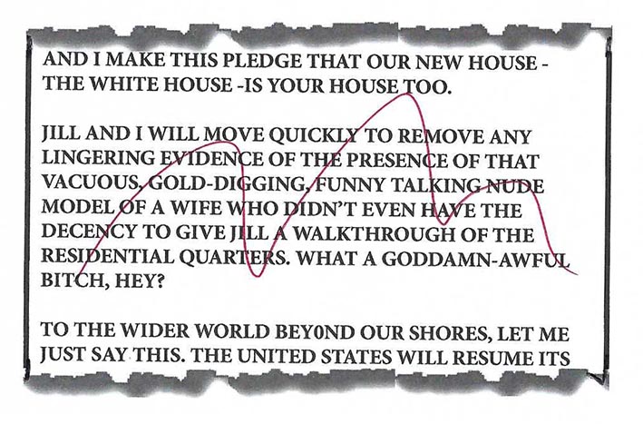 The Bug understands one of President Biden’s senior speech writers saw the offending paragraphs just as the speech was about to be uploaded to the autocues on the ceremonial platform in front of the Capitol building and quickly ran a red pen through them (below).