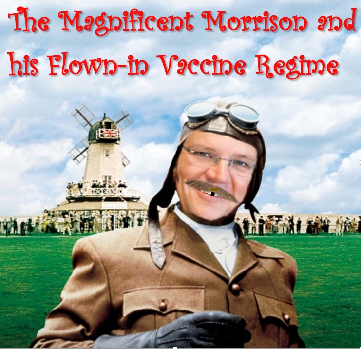 But it was last night’s segment on the Channel 9 news when Chris Uhlmann knocked me over with his own take on The Magnificent Morrison and his Flown-in Vaccine Regime.