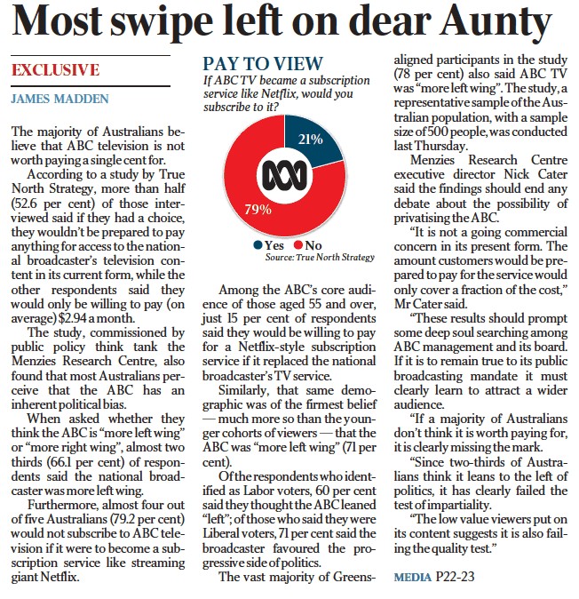 Right on queue Monday’s story quoted the Menzies Research Centre’s executive director Nick Cater as saying the findings “should end any debate about the possibility of privatising the ABC”.