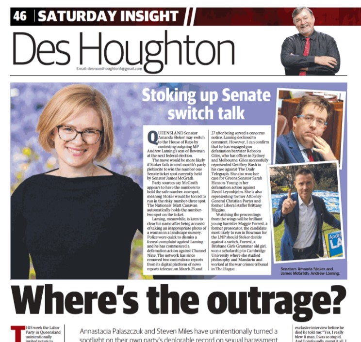 This week the ad featured a large item claiming that Queensland LNP Senator Amanda Stoker would be shifting to the lower house of our federal parliament to replace the multiple Facebooker and upskirt snapper Andrew Laming. (main picture)