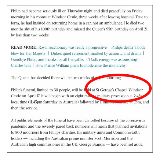But back to The Oz. Its story said the Duke funeral service would be held in “St Geroge’s chapel” at Windsor Castle.
