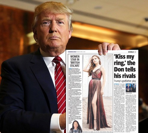 The headline on the story was presented unmistakeably as a quote from his speech and included what was presumably a summary of his demands to Republicans wanting to get on in the world of US politics: “Kiss my ring.” (pictured)