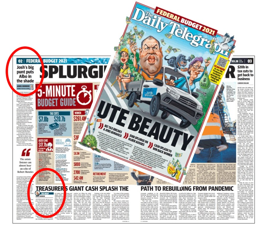 By then readers would need to have waded through page after page of positive headlines on top of a myriad of stories about what the Tele’s own editorial admitted was a budget aimed squarely at the re-election of the Morrison Government.