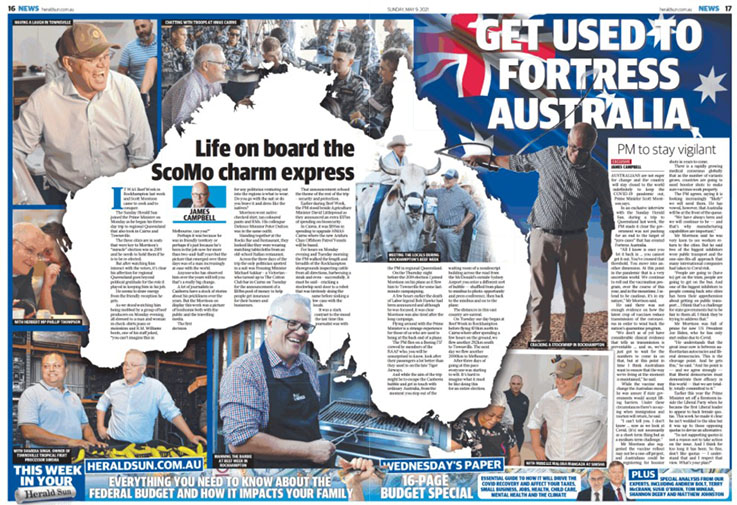 Campbell does admit that the a lot of the Canberra media pack would have stories of Morrison’s prickliness over the years but concludes…”But the Morrison on display this week was a picture of bonhomie both with the public and the travelling media”.