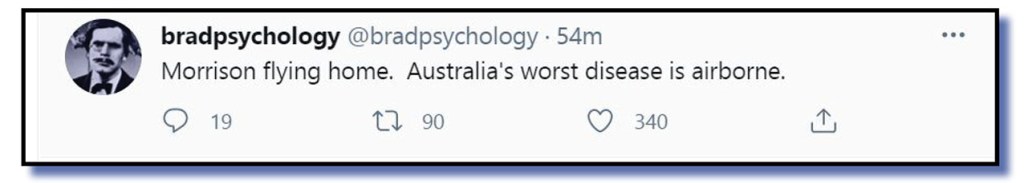 Our Twitterer of the Week showed a sound knowledge of the past behaviour of our prosperity- indoctrinated Prime Minister while giving him both barrels over his reported attempts to stop the ABC running a Four Corners program on his connections with those within the far-right-wing QAnon organisation.
