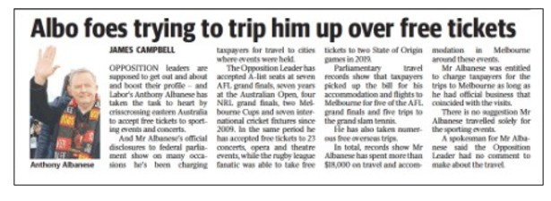 The answer was inadvertently provided by the version of Campbell’s crap about Albo’s travel costs that ran in the Sunday Tasmania in Hobart. (pictured)