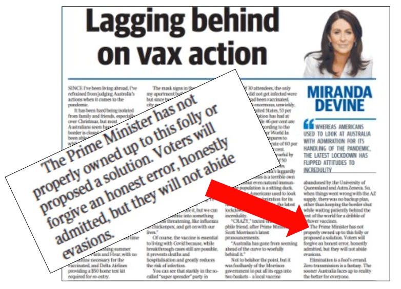 In her latest column, News Corp Australia’s very own Trumpeter, Miranda Devine, has a dig at the Morrison Government’s botched vaccine rollout.