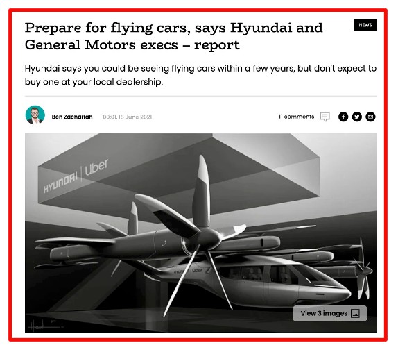The Morrison Government has welcomed statements by global car manufacturers General Motors and Hyundai of plans to produce flying cars. (pictured)