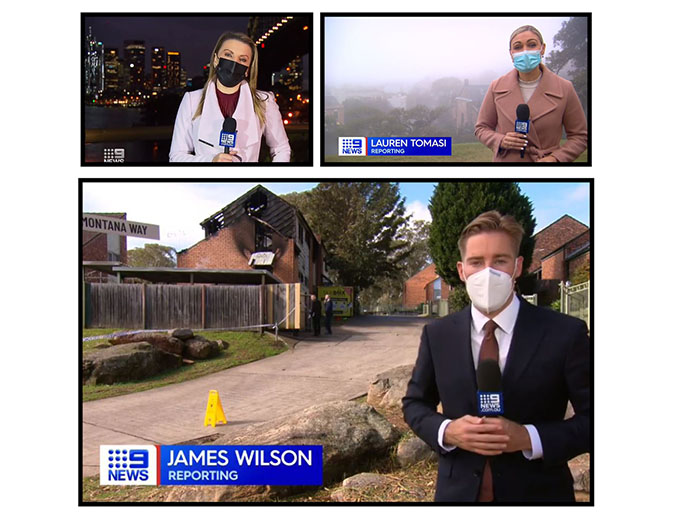 At top is a montage of Channel 9 Sydney reporters banging away to camera on Wednesday night, giving lip readers no chance at all to take in their words of wisdom. Across town, field journos at the ABC such as the excellent Mark Reddy were also masked up in the 7pm bulletin MGH took in last night.