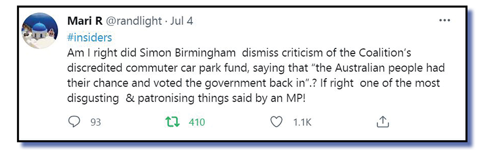 On the ABC’s Insiders, he argued that voters by returning the government at the 2019 federal election had somehow endorsed the industrial-strength, rolled gold-standard, top-shelf, pork-barreling that the government engaged in before that election even though they didn’t know about it then.