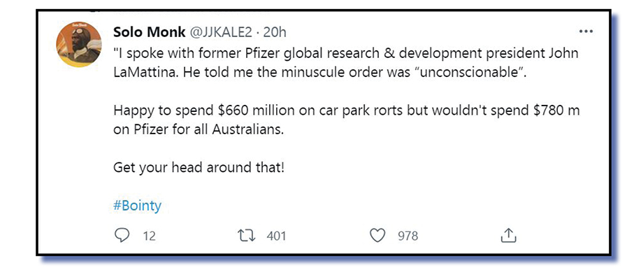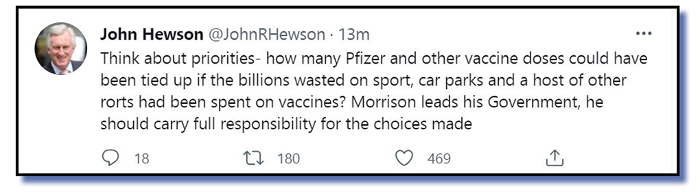 Other topics that bubbled along during the Twitterverse week, much to the chagrin of the Morrison government, were the latest pork-barreling scandal surrounding computer car parks and continuing mutterings that the government sooner or later missed the opportunity to grab large supplies of the effective Pfizer vaccine.