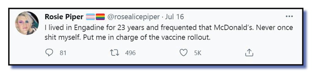 Especially as our winner cleverly combined two shitty little stories that the sewer rats on Twitter had great fun with this past week: Bill Shorten’s use of the word “shitshow” to describe the Morrison government’s stroll-out of COVID-19 vaccines and the fact that the Prime Minister emerged from hibernation – sorry quarantine – and decided that the most pressing matter facing the nation was to tell Kyle Sandilands that he did not shit his pants at Engadine Maccas back in the late 90s.
